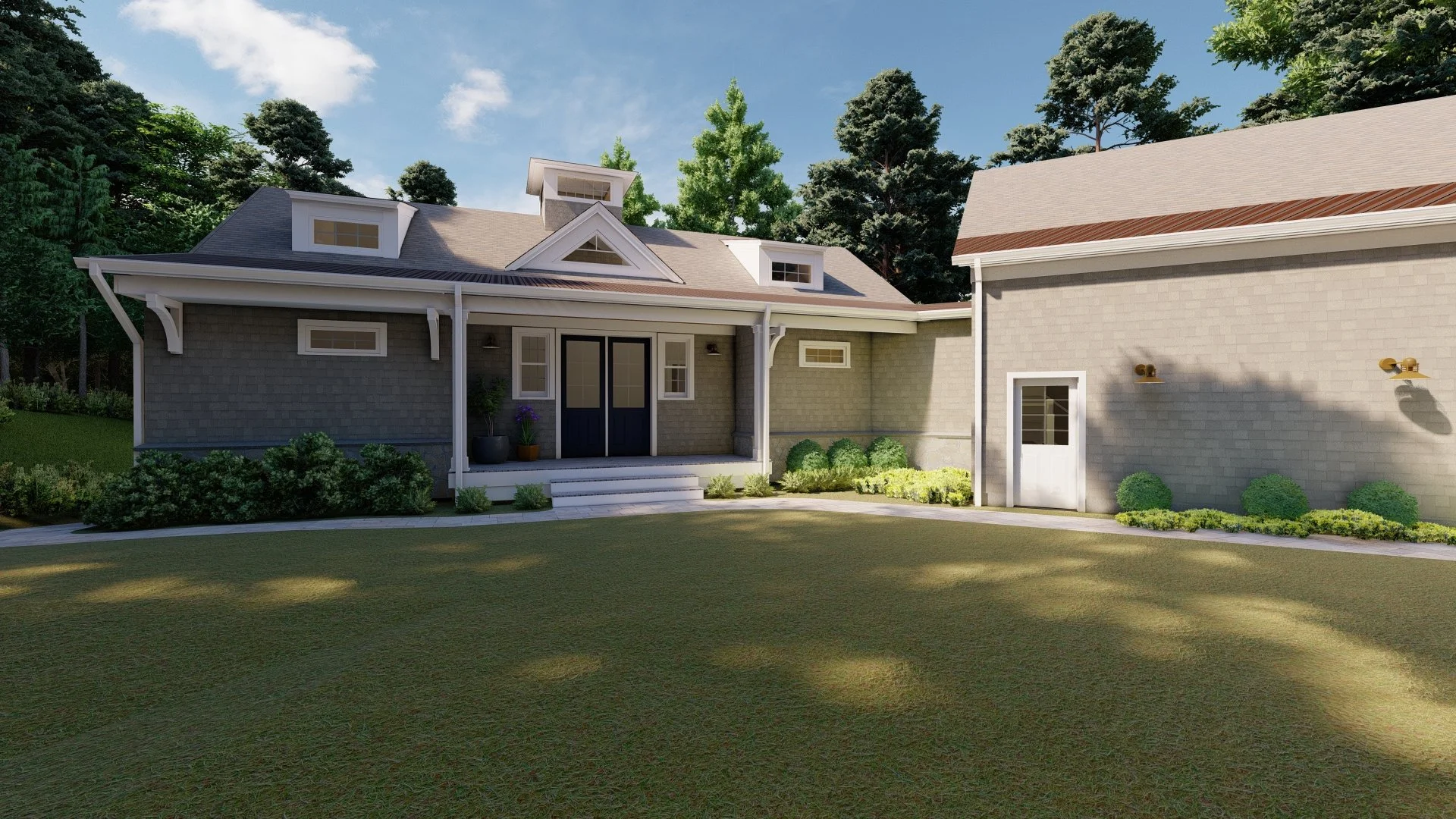 A beautiful private lot nestled into a massive grove of Hemlock trees was the perfect location for this couple to build their dream home. The site presented multiple challenges in terms of the size, shape, and proximity to wetlands that influenced how the structure was placed within the landscape.